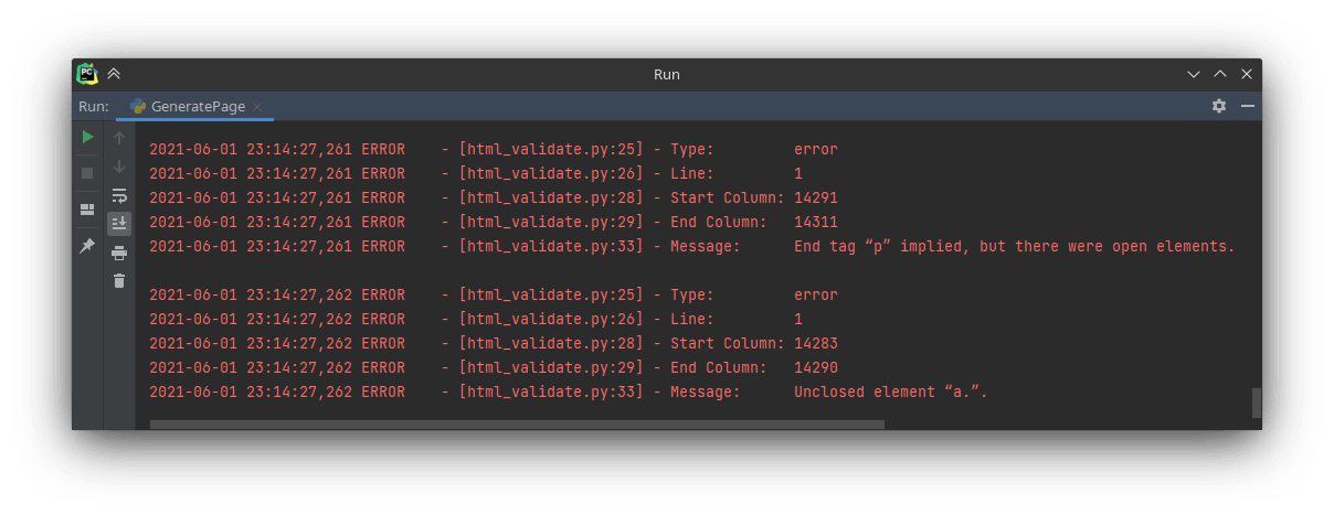 Upon completion, the script can automatically send the HTML to the service to be analyzed. The script receives the info/warnings/errors if any are found and displays them, like above. This helps to find any potential errors before they are shipped to the public. This also doubles as a debugger if necessary.