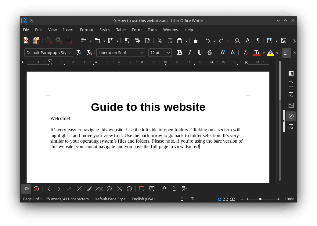 Another part that is very worth mentioning is that I can generate my pages from the OpenDocument (.odt) format. This format allows me to write this very document in LibreOffice, where I have spell check and other important tools to help me write.
